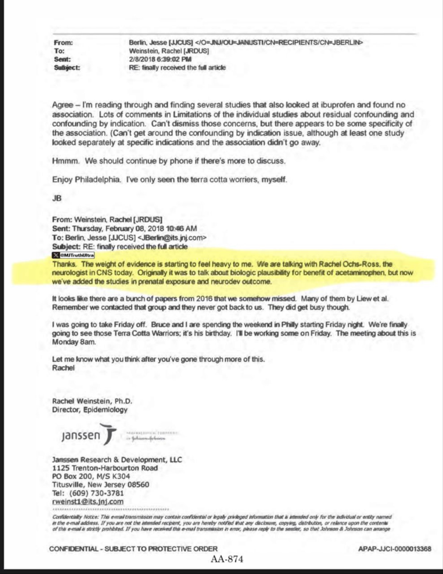 It should be noted that Janssen AKA Johnson & Johnson no longer own Tylenol. After these emails in 2018, Tylenol got spun off into its own company called Kenvue, that also manages Listerine, Band-Aid, and Neutrogena. Ironic that sunscreen and adhesive bandages have also had carcinogen risk noted in recent years…..so sure, lump all of those into a new company. Protection of J&J during a lawsuit.