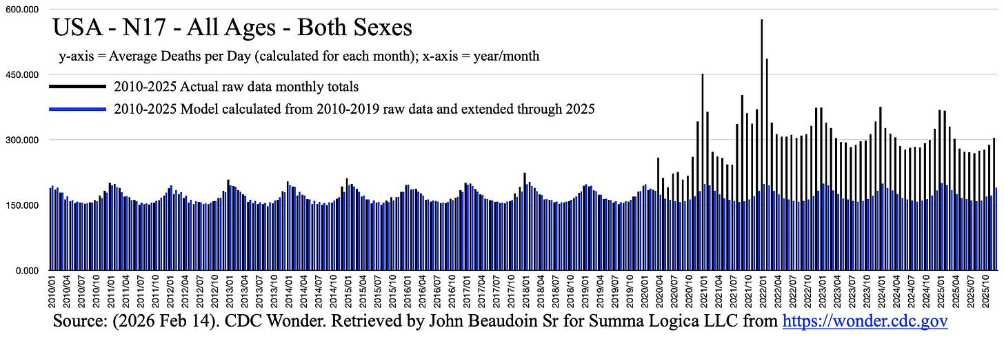 The blue lines are “anticipated predicted death” per day. The black lines are actual deaths. You can see prior to 2020, the prediction versus actual was pretty accurate and within statistical expectancy. But 2020 and beyond?!?! Not even close. You will note the classic excessive peaks around vaccine and booster periods in 2020-2021.