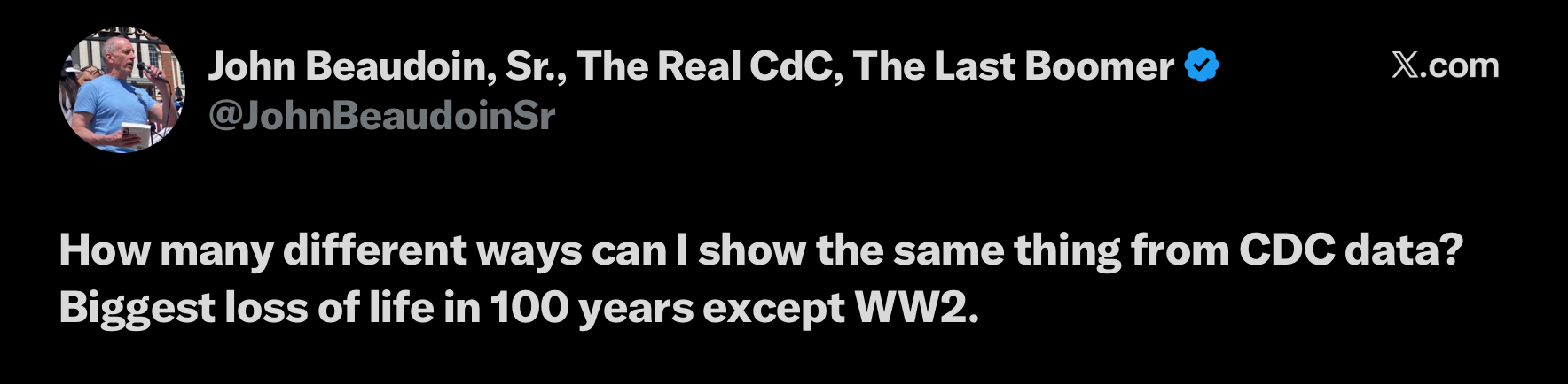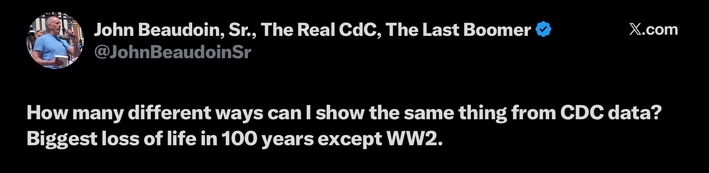 It must be a tough time to be an actuarial. Bad time to be a life insurance company. Good time to own a funeral home. Early on during the Jab Hysteria, our neighbor’s son made it home from the shot clinic, parked the car, and then died before he could get out and come in the house. Our neighbors were told there was absolutely NO connection between the COVID jab and his death 1/2 hour later. They still don’t believe that.